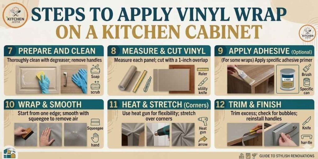 Start by removing handles and cleaning every surface. Grease ruins adhesive strength. Then measure each cabinet door and cut your vinyl with extra margin. Peel a little backing from the top, line it up, and smooth it down slowly with a felt squeegee or soft tool.